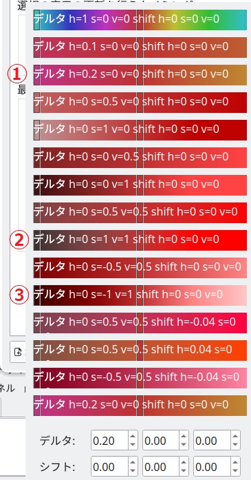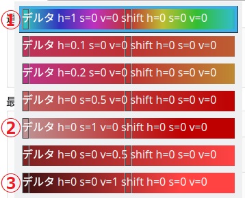 一番下に数値が書いてあるけど、一番目のバーは H 0.2のスライダー、2番目は S=1 V=1、3番目は S=-1 V=1にゃ。